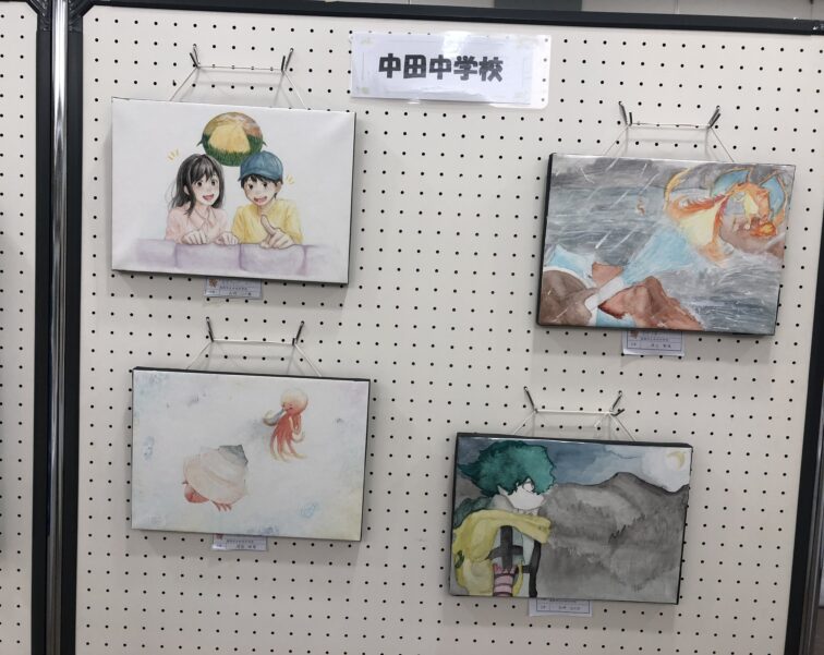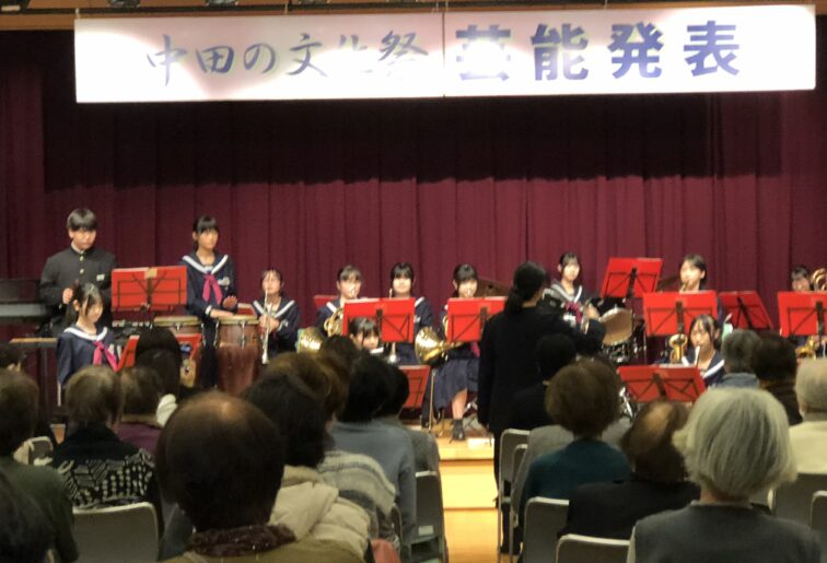 2025.11.4 NEW 1学年 2学年 3学年 【11/2】中田の文化祭の様子 中田の文化祭に吹奏楽部が出演しました。 新部長、副部長のあいさつです。 2曲披露しました。ほぼ満席でした。 美術部も出品しています。