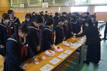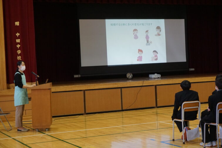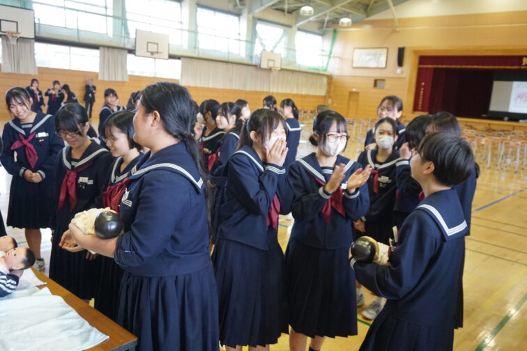 2025.11.10 1学年 2学年 3学年 【11/7】5,6限 学校保健委員会 今年は、助産師 曽我 葉子先生をお招きし、「いのちの授業」をしていただきました。 生きているということは奇跡であり、すごいことなのだということを学びました。 体験活動 沐浴人形の抱っこ体験の様子です。 妊婦ジャケットを着用してみて、お母さんの大変さを実感しました。 聴診器で心音を聴いてみました。 胎児の模型に触れて、実際の重さや大きさを知りました。