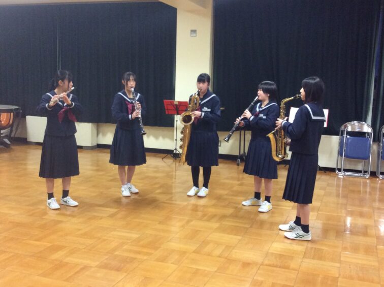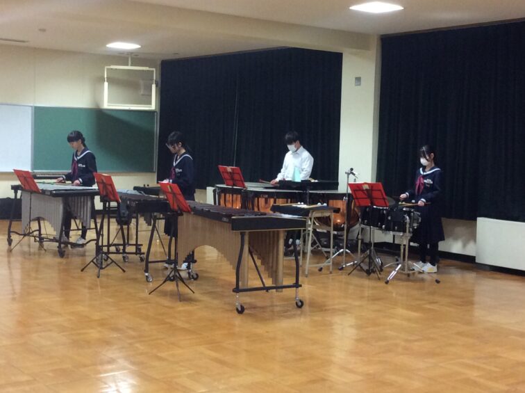 2026.1.13 1学年 2学年 【1/9】吹奏楽部 アンサンブルコンテスト前日の様子 吹奏楽部は3つのグループに分かれて、10日のアンサンブルコンテスト高岡地区大会に出場します。リハーサルを兼ねて、放課後、演奏披露会を行いました。 打楽器4重奏 木管5重奏 金管7重奏 限られた時間の中で心をひとつにして一生懸命練習してきました。2年生は前年度より成長した演奏で1年生を引っ張っていってほしいものです。Do your best!!
