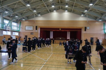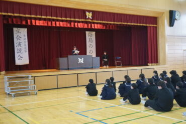 2026.3.9 全校生 前期生徒会長選挙 令和8年度の前期生徒会長選挙が行われました。 中田中学校をよりよくするために、全員が蔭島さんの意見に真剣な面持ちで耳を傾けていました。 選挙管理委員会の働きかけで無効票0で選挙を終えました。